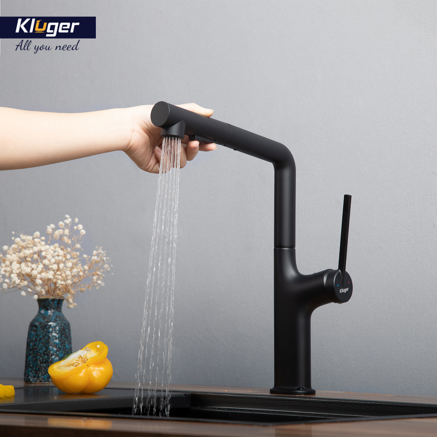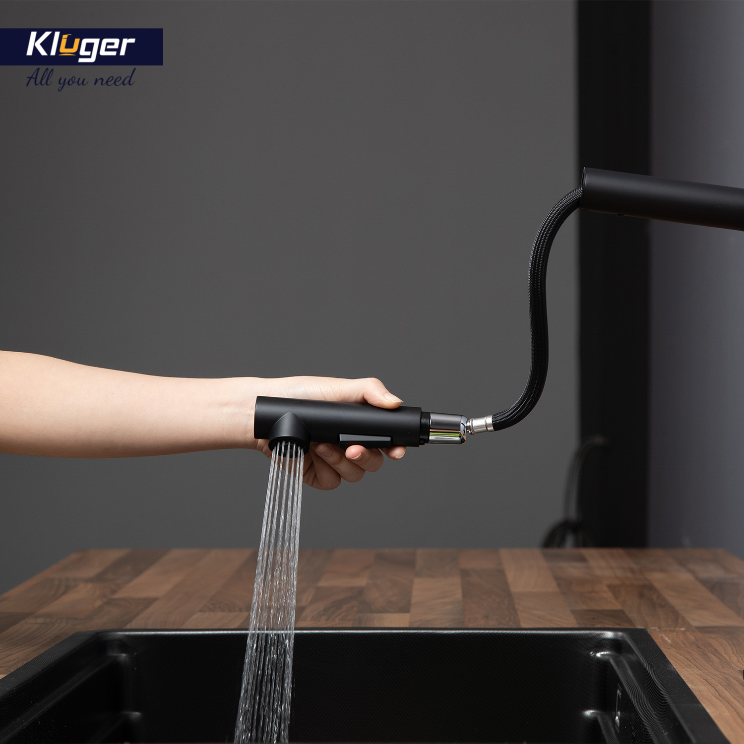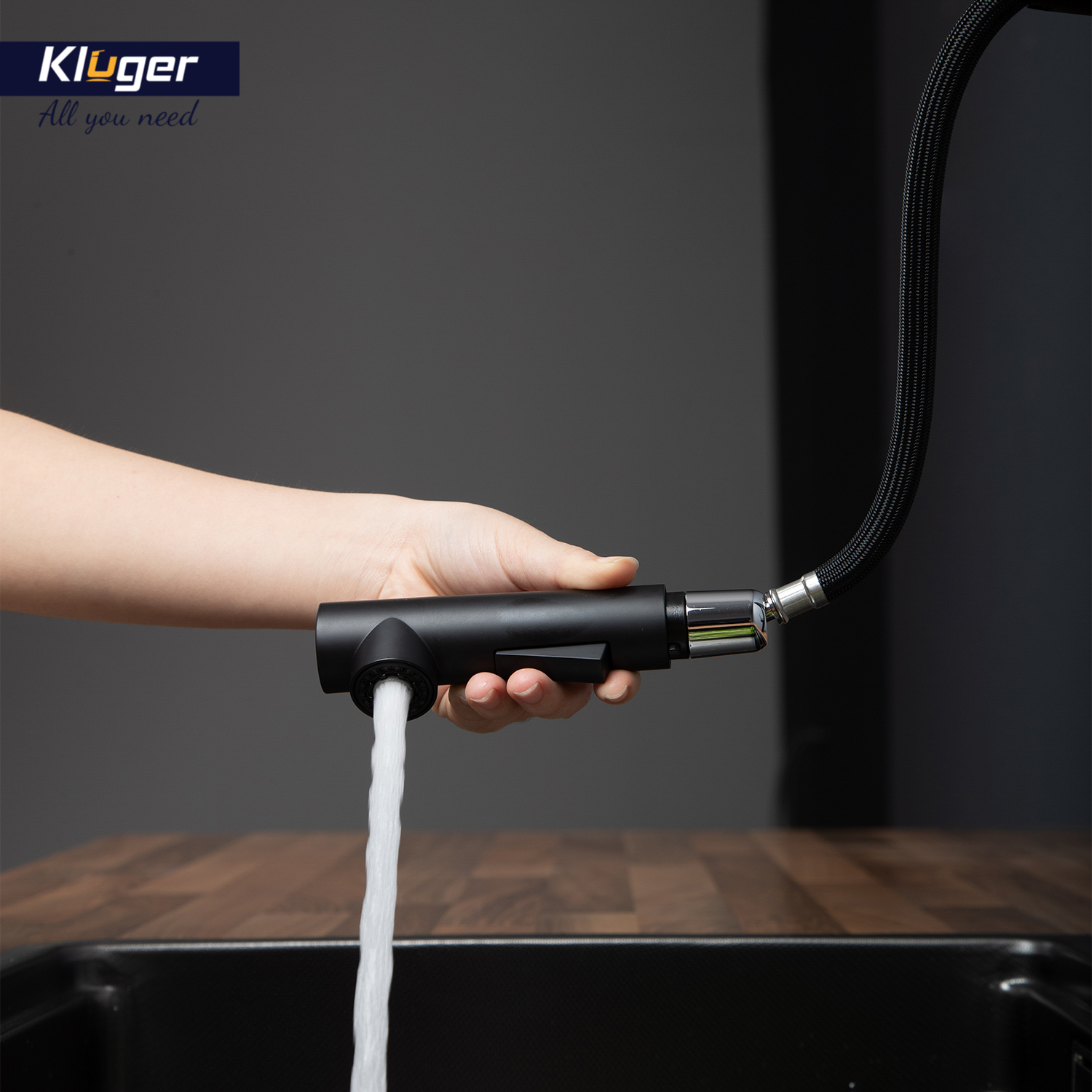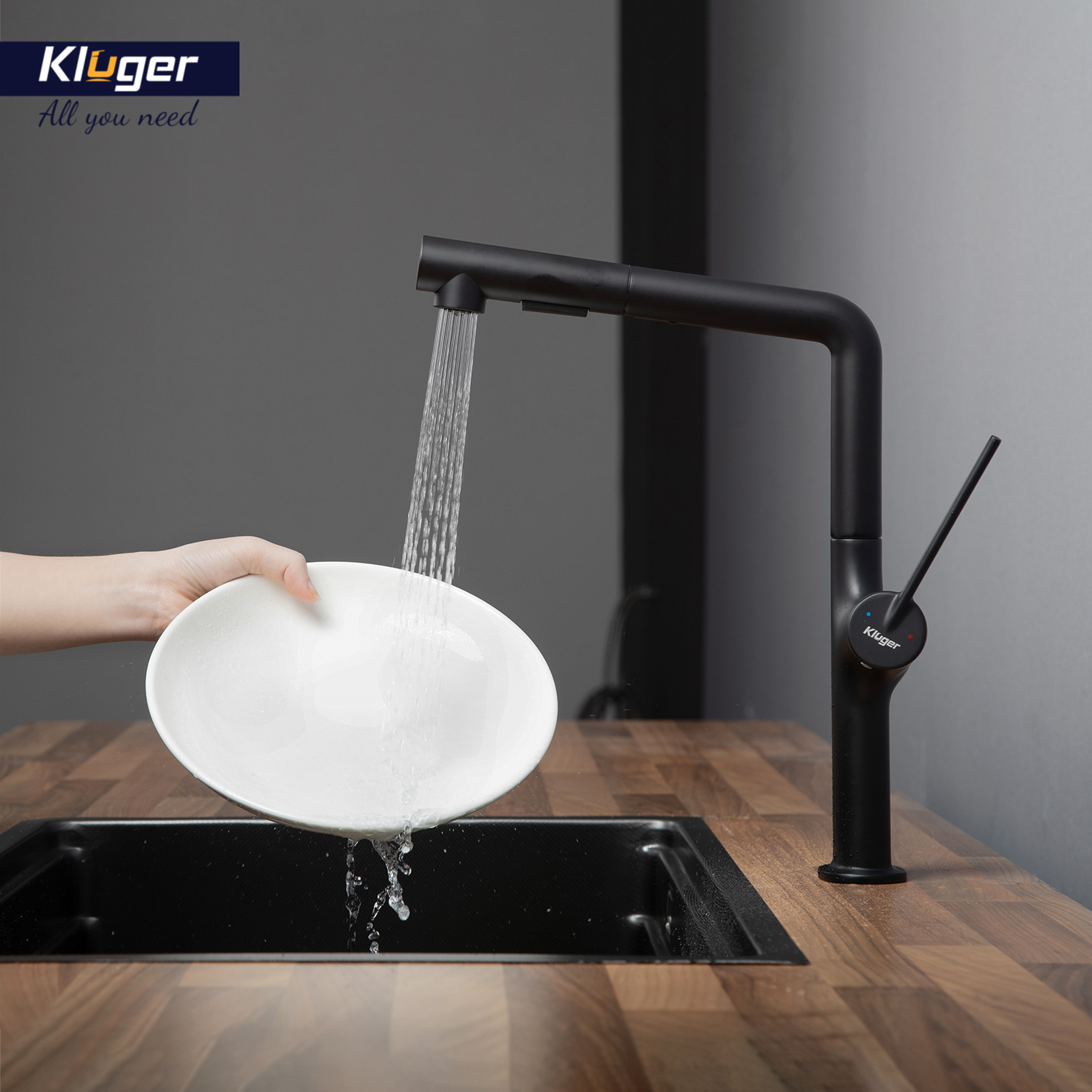 Vòi rửa bát Kluger KLF0001B sở hữu vẻ đẹp tinh tế với lớp phủ đen nhám Amber Series, hình dáng thanh mảnh, đường nét quý phái, phù hợp với phong cách tối giản.