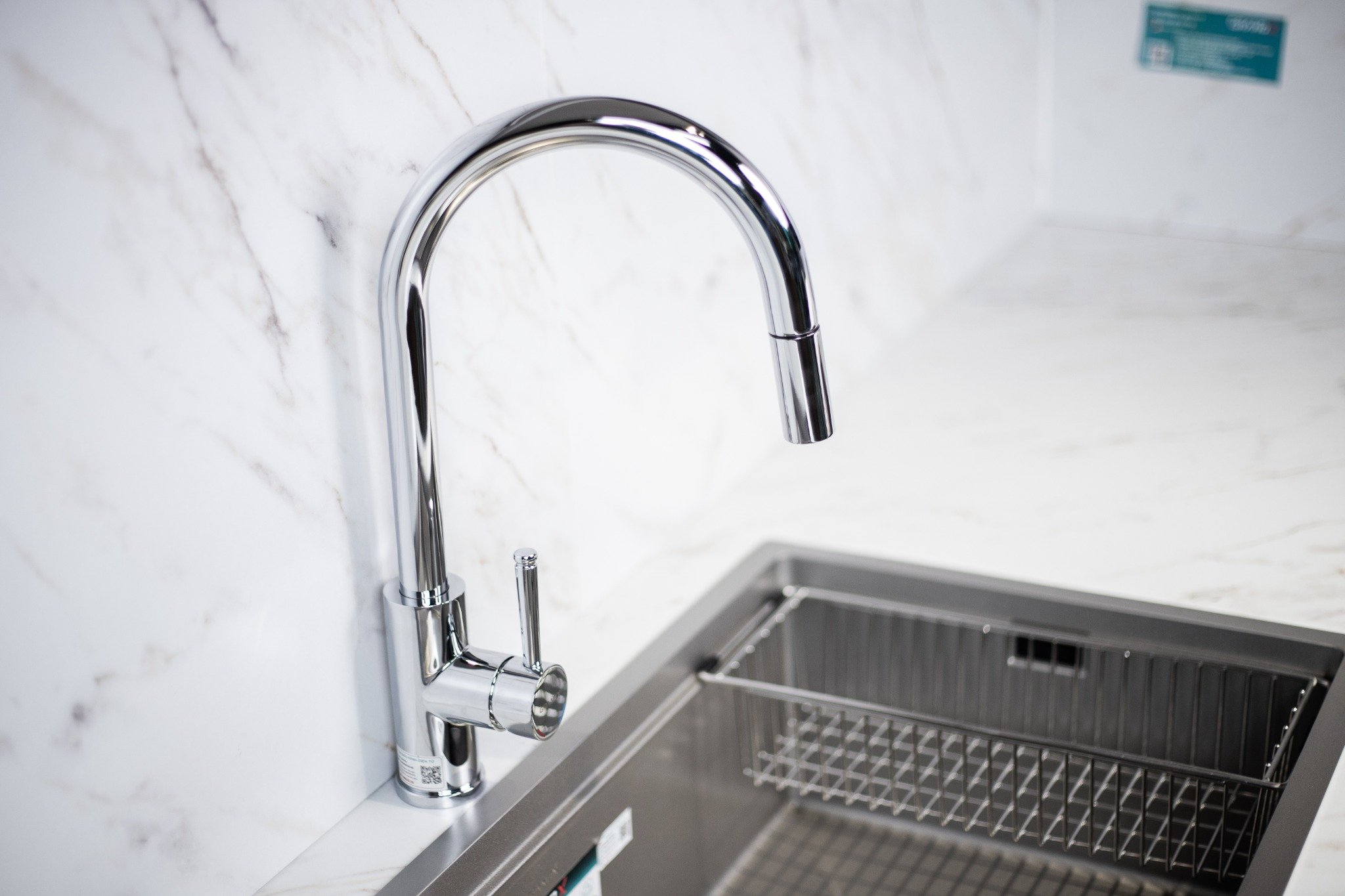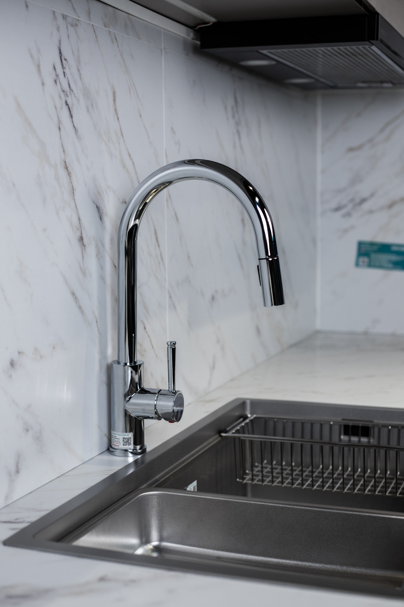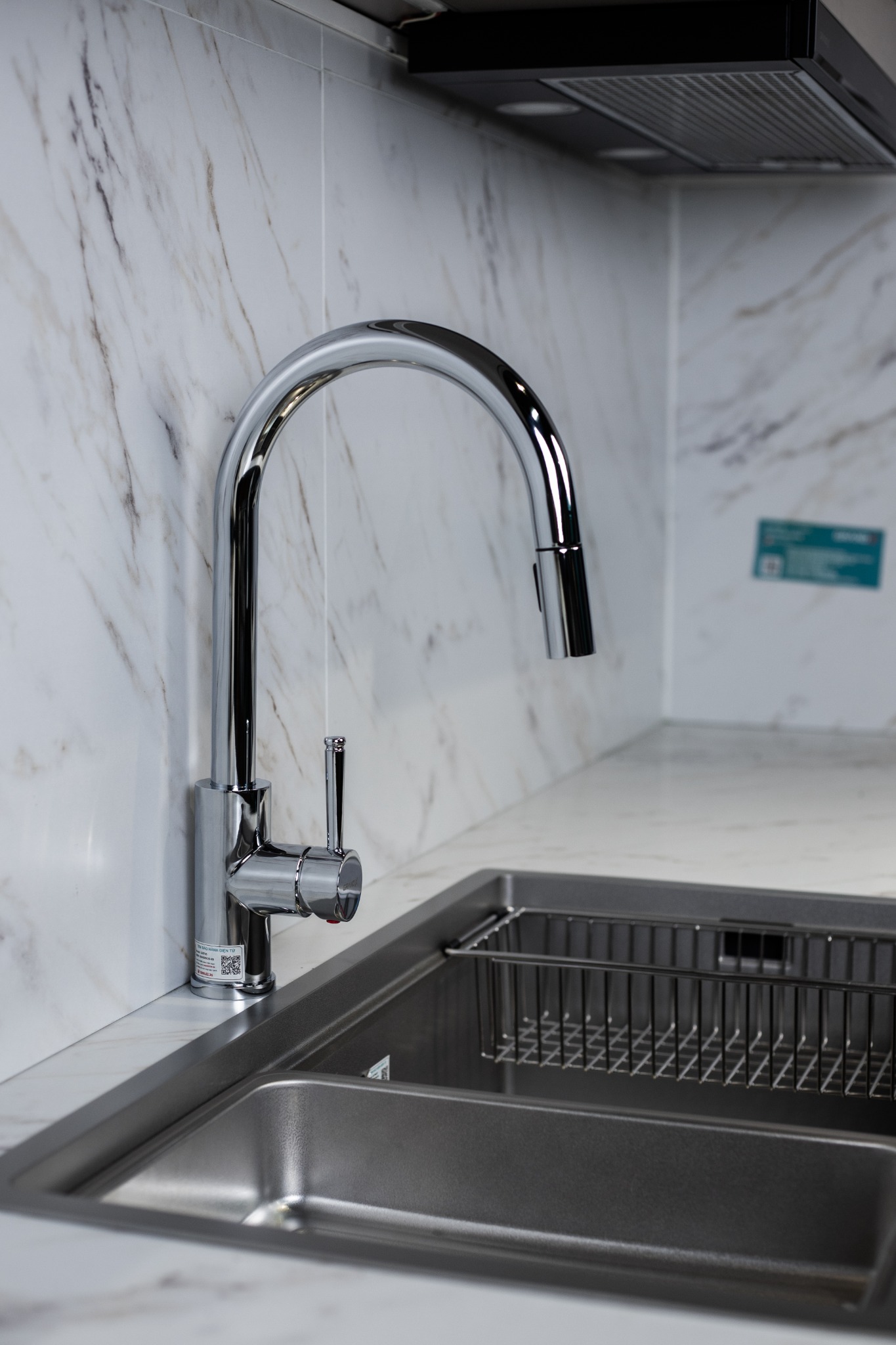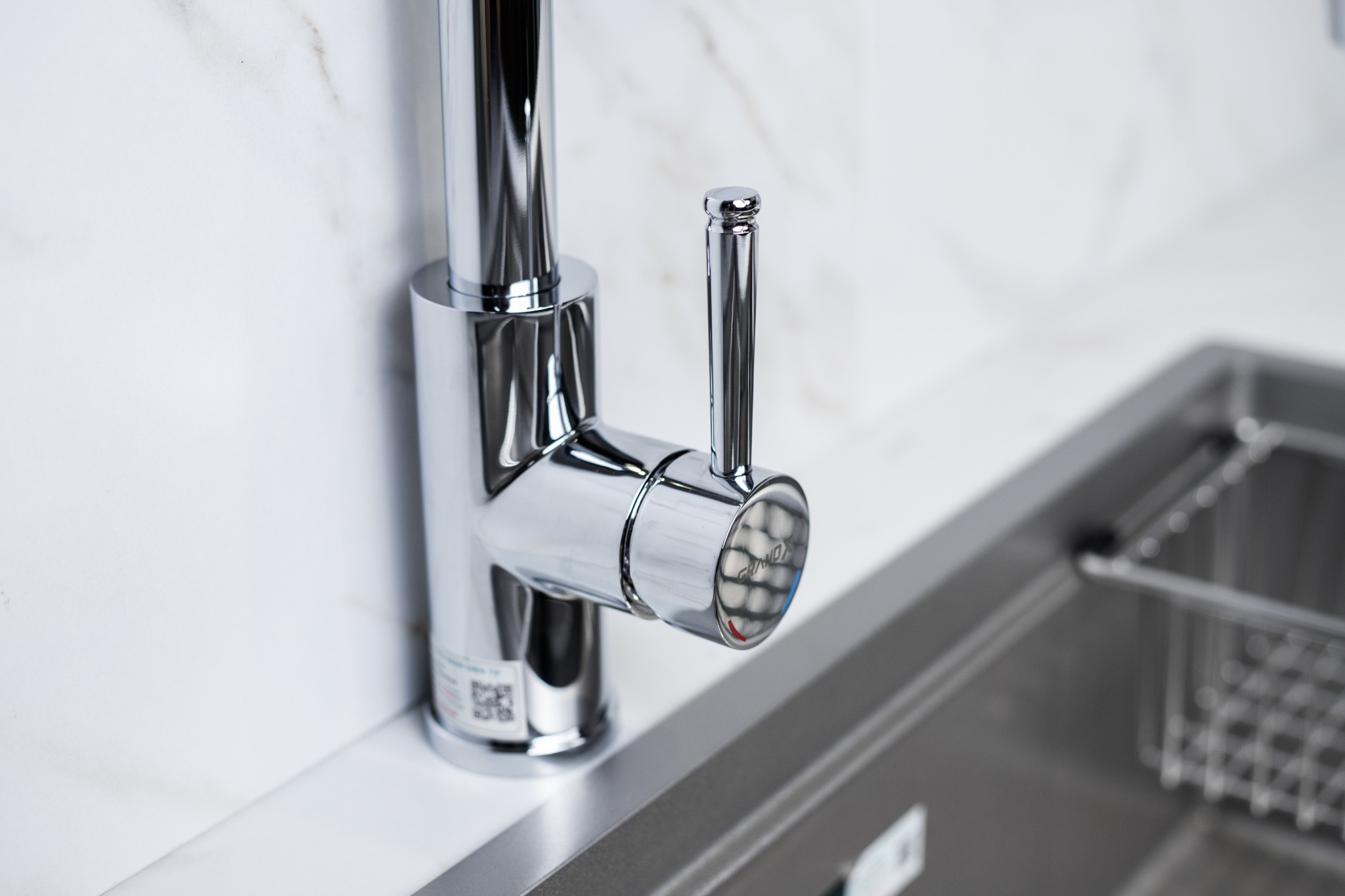 Bề mặt vòi được mạ PVD Chrome sáng bóng giúp chống bám bẩn, dễ vệ sinh và duy trì độ mới lâu dài, ngay cả trong môi trường ẩm ướt của nhà bếp.