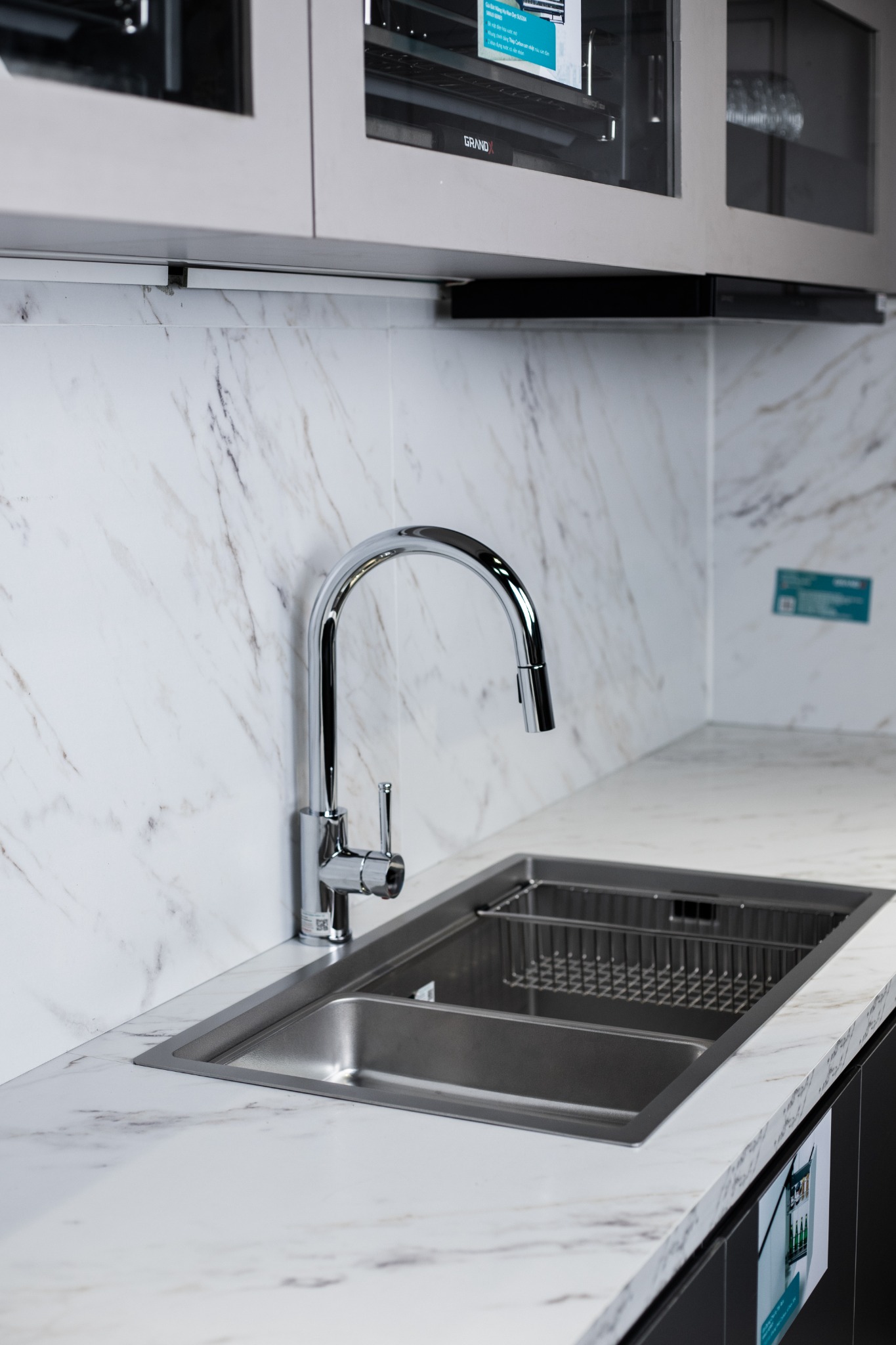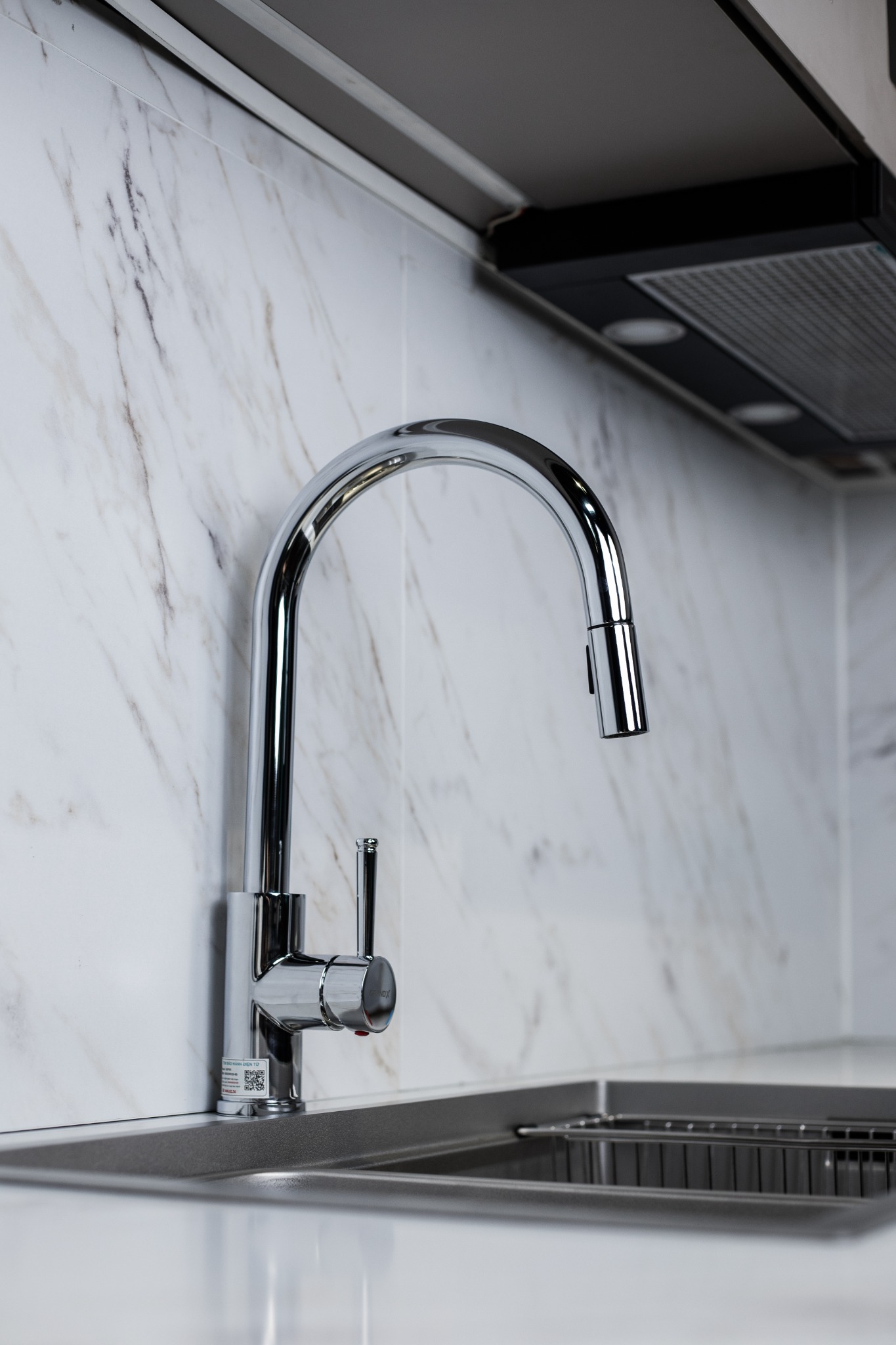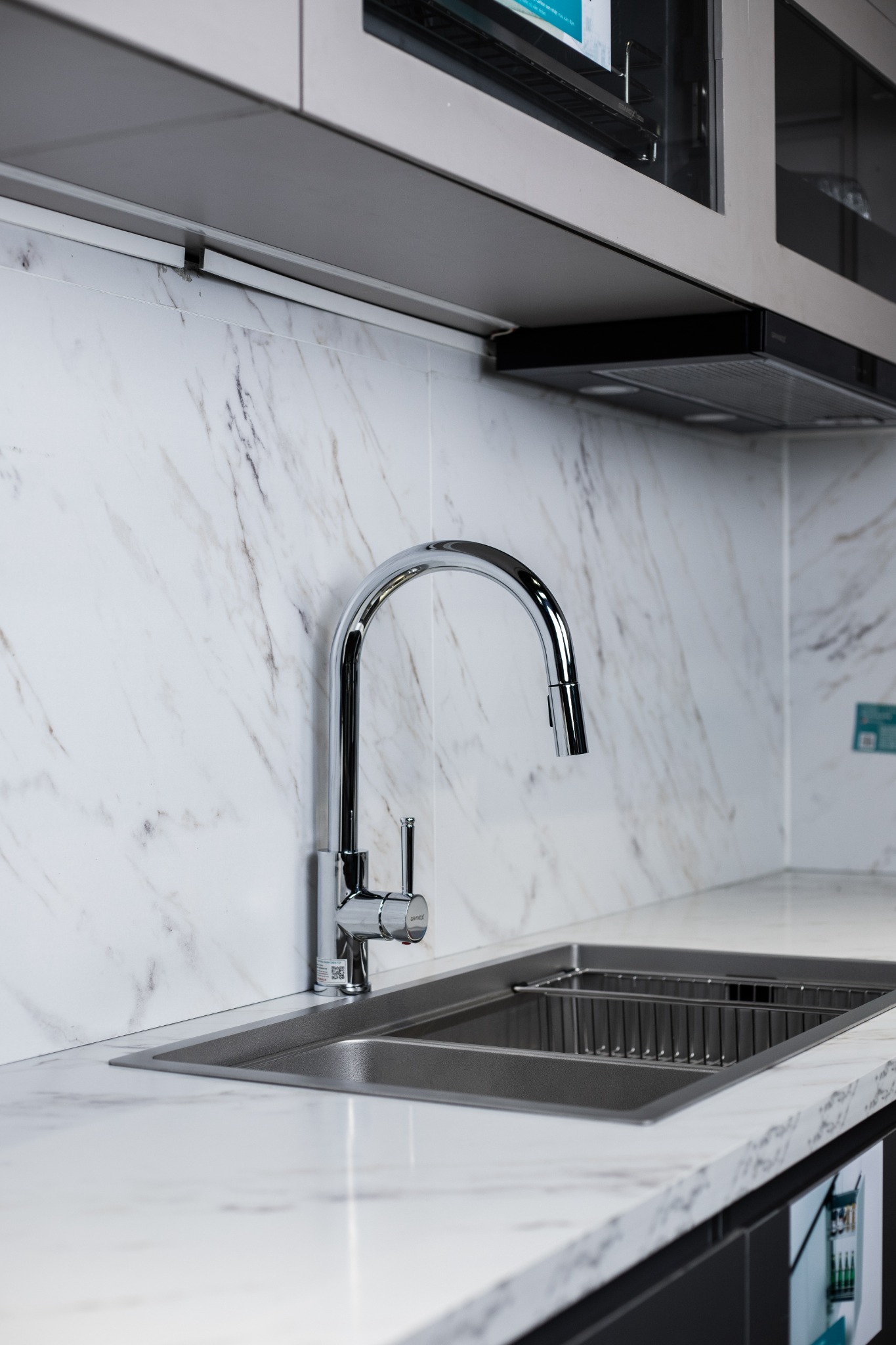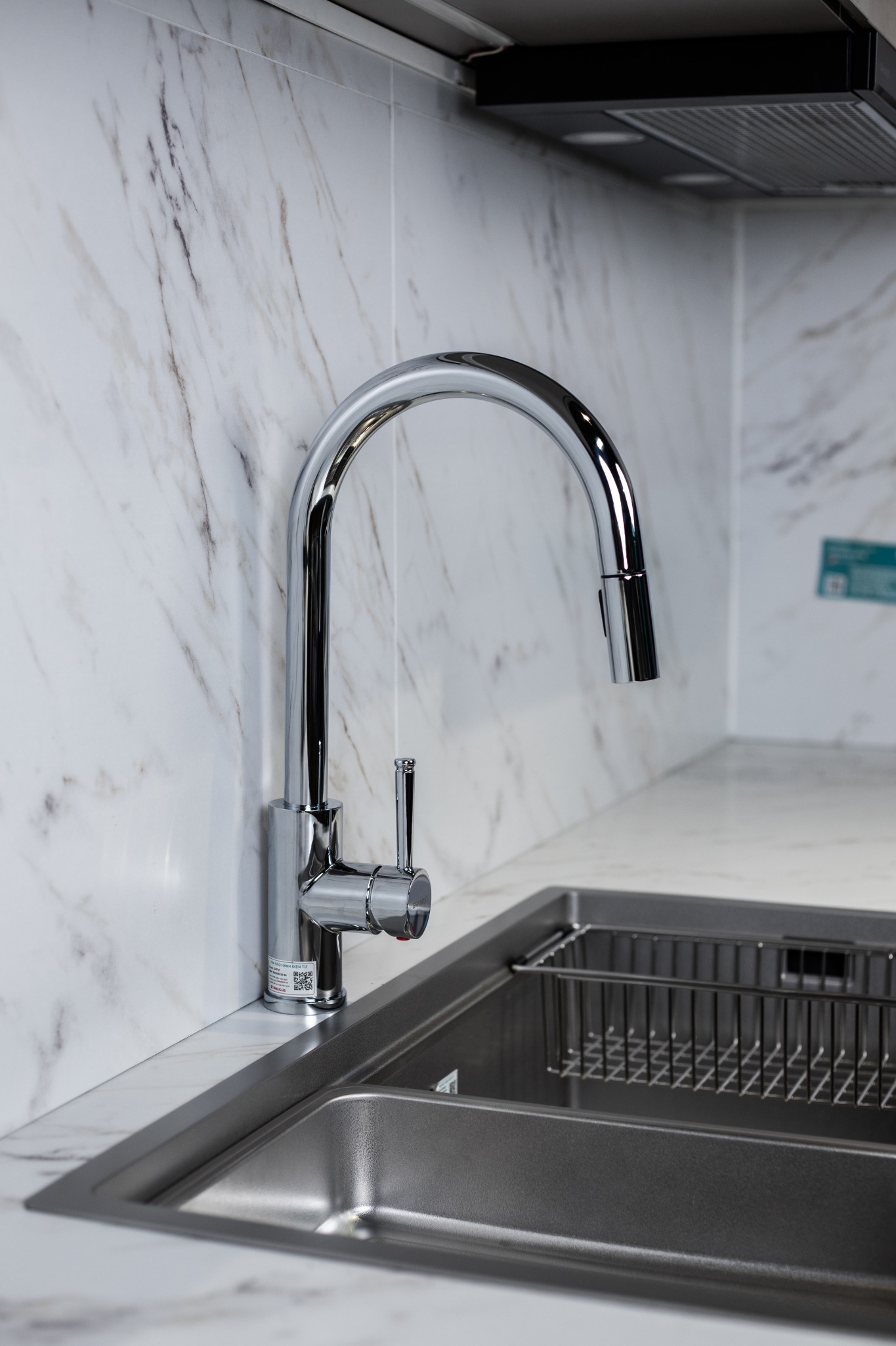 Bề mặt vòi được mạ PVD Chrome sáng bóng giúp chống bám bẩn, dễ vệ sinh và duy trì độ mới lâu dài, ngay cả trong môi trường ẩm ướt của nhà bếp.