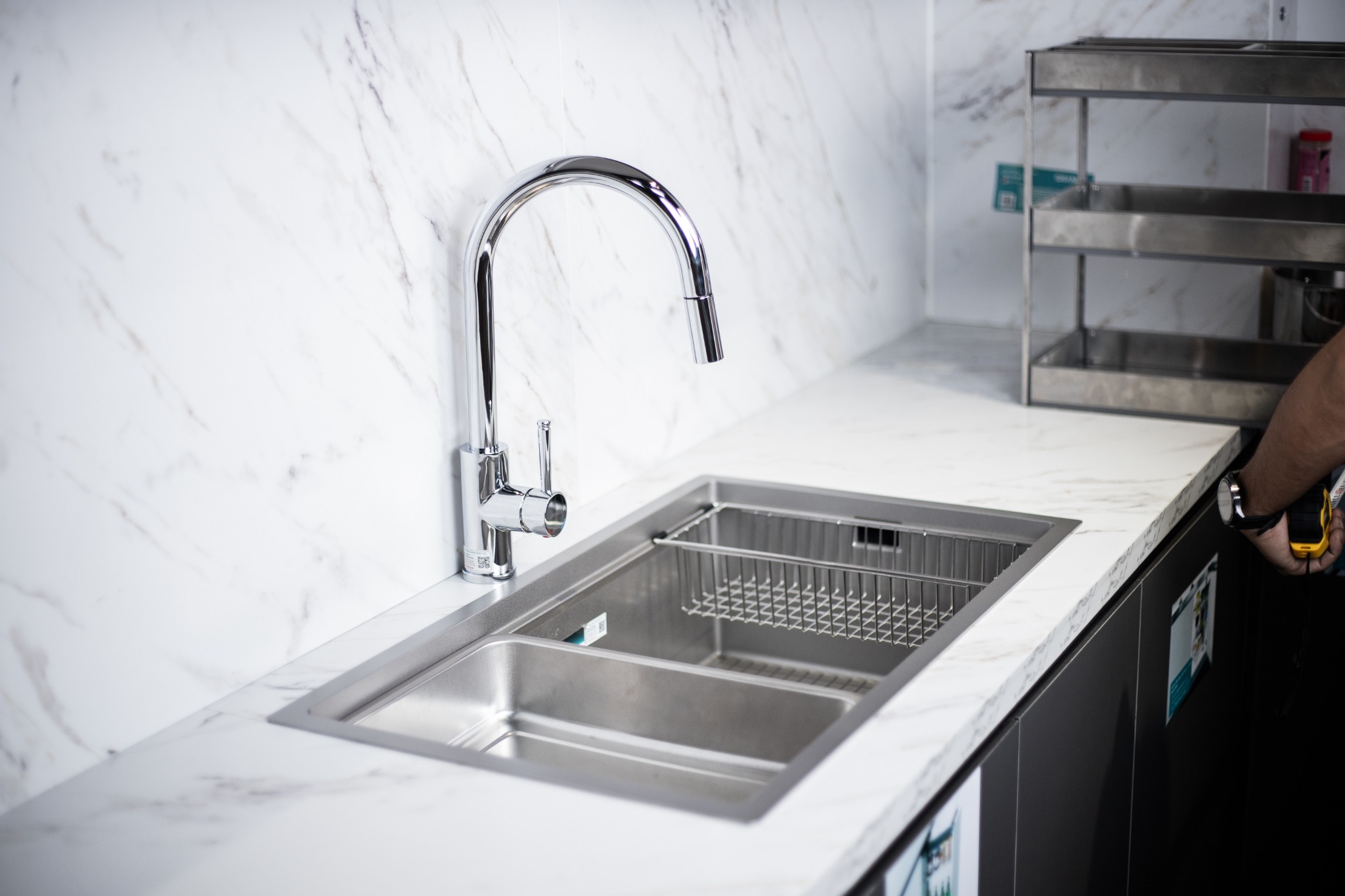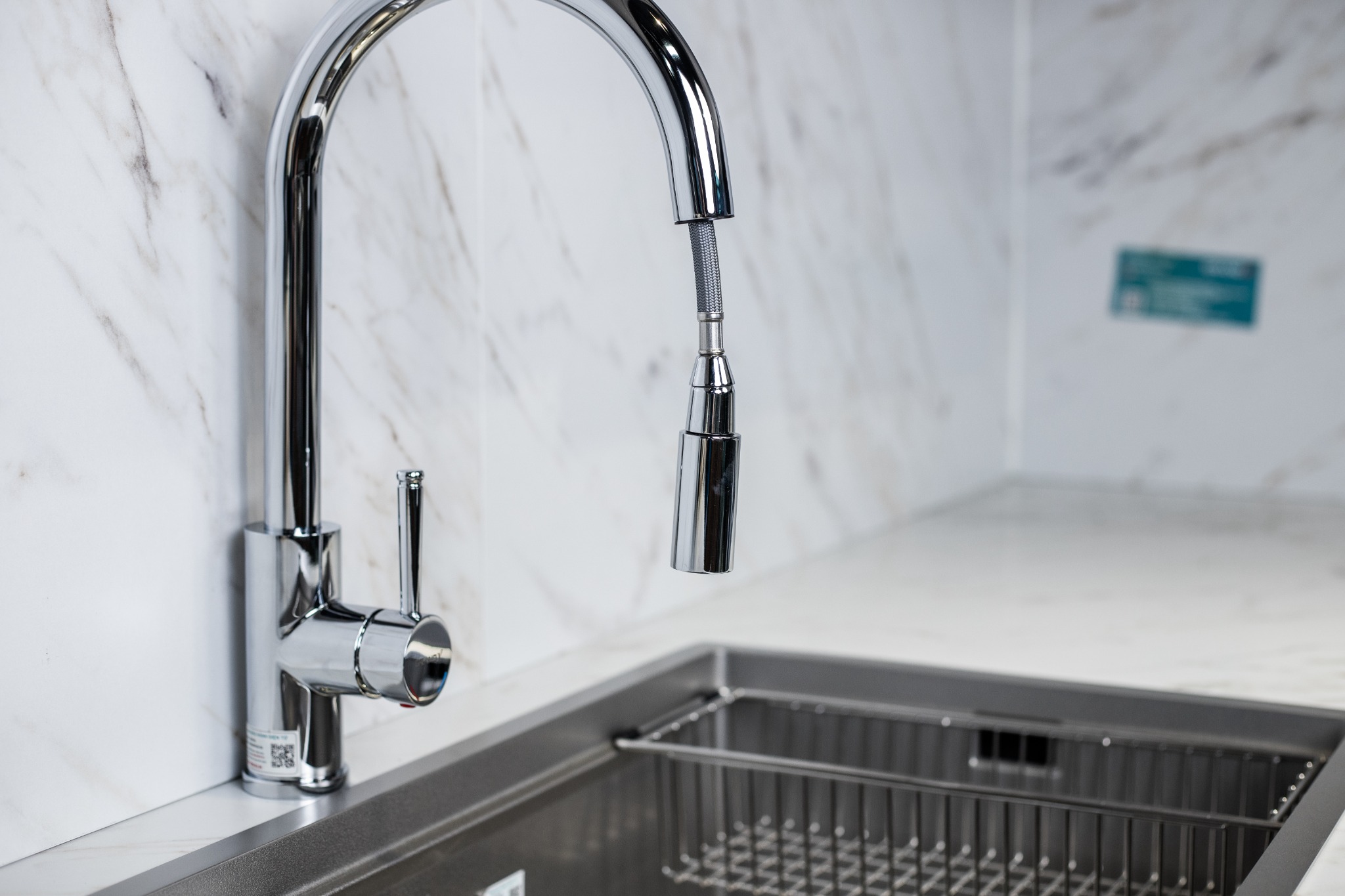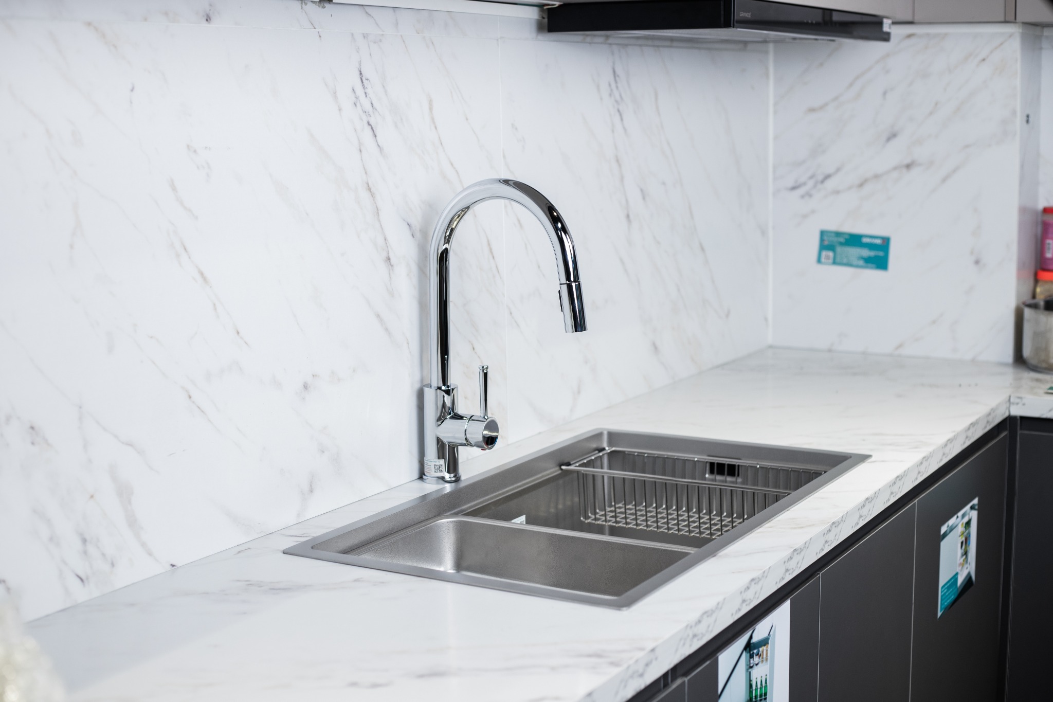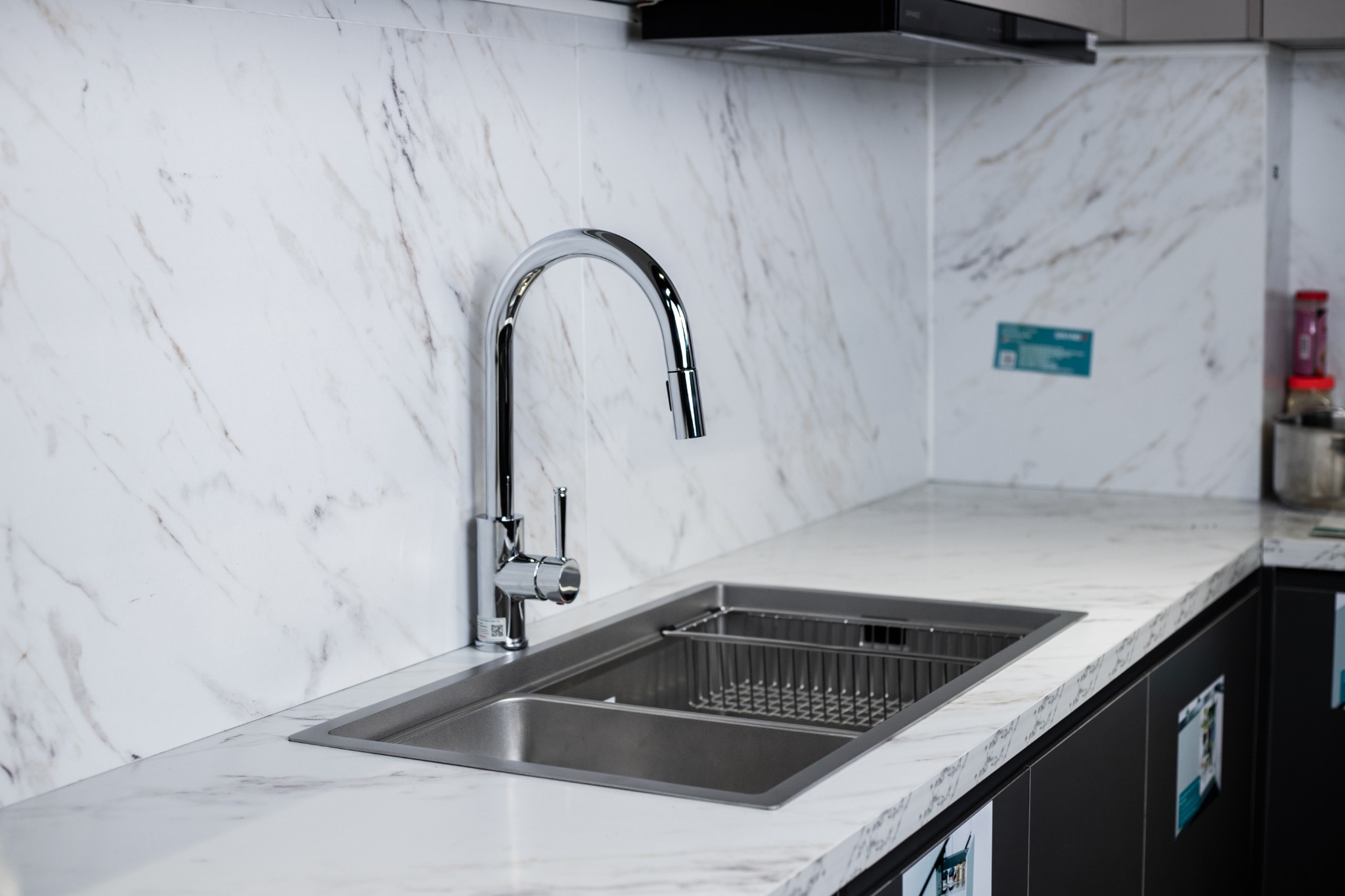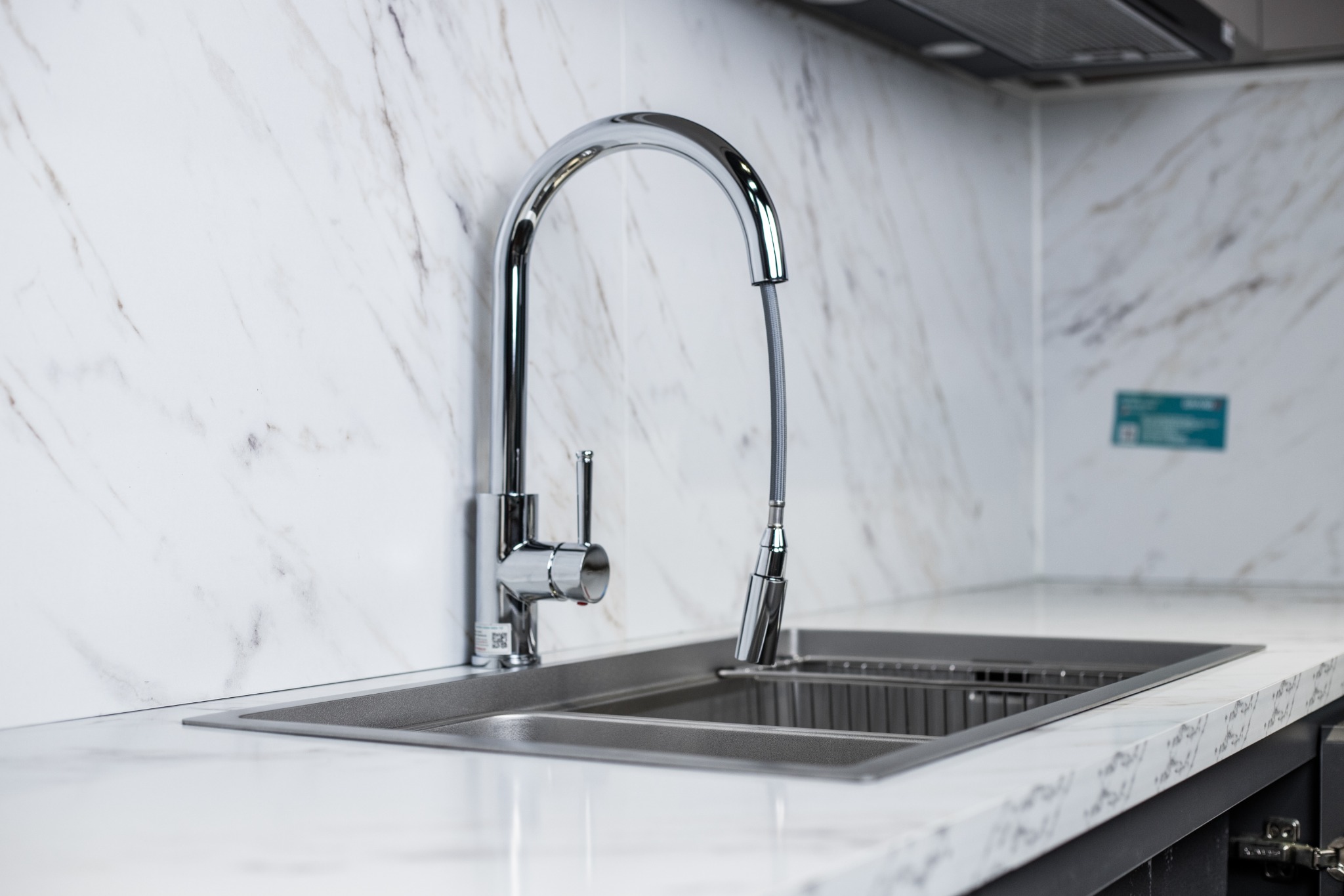 Bề mặt vòi được mạ PVD Chrome sáng bóng giúp chống bám bẩn, dễ vệ sinh và duy trì độ mới lâu dài, ngay cả trong môi trường ẩm ướt của nhà bếp.