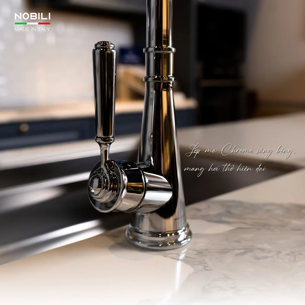 Lớp mạ Chrome hoàn thiện sáng bóng, đảm bảo độ bền cao, chống bám bẩn hiệu quả: Công nghệ mạ Chrome của vòi bếp Nobili không chỉ tạo nên lớp bề mặt sáng bóng sang trọng mà còn đảm bảo độ bền vượt trội theo thời gian. Áp dụng quy trình mạ nhiều lớp đạt chuẩn châu Âu, lớp chrome trên vòi Nobili giúp chống oxy hóa, chống trầy xước và dễ dàng vệ sinh, giữ cho sản phẩm luôn như mới sau thời gian dài sử dụng. Nhờ lớp phủ đồng đều, bám chắc, vòi không bị bong tróc dưới tác động của nước nóng, hóa chất tẩy rửa hay độ ẩm cao – đáp ứng hoàn hảo tiêu chuẩn của một gian bếp hiện đại và tinh tế.