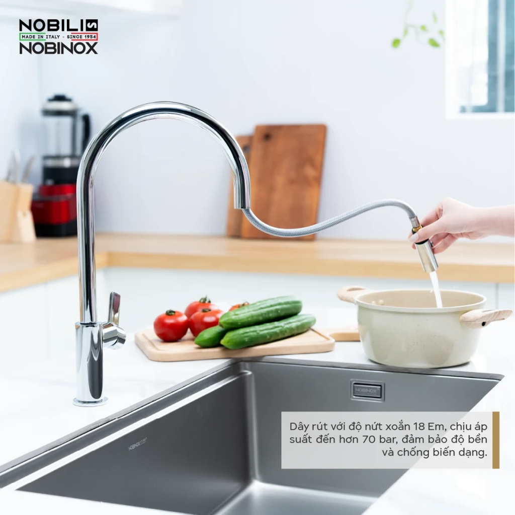 Không chỉ linh hoạt, dây rút cao cấp của các dòng vòi rửa bát dây rút Nobili còn chịu được áp lực nước vượt 70 bar, cho thấy khả năng vận hành ổn định trong điều kiện áp suất mạnh. Nhờ đó, dòng nước luôn duy trì mạnh mẽ, hỗ trợ rửa sạch hiệu quả mà không ảnh hưởng đến độ bền của hệ thống.