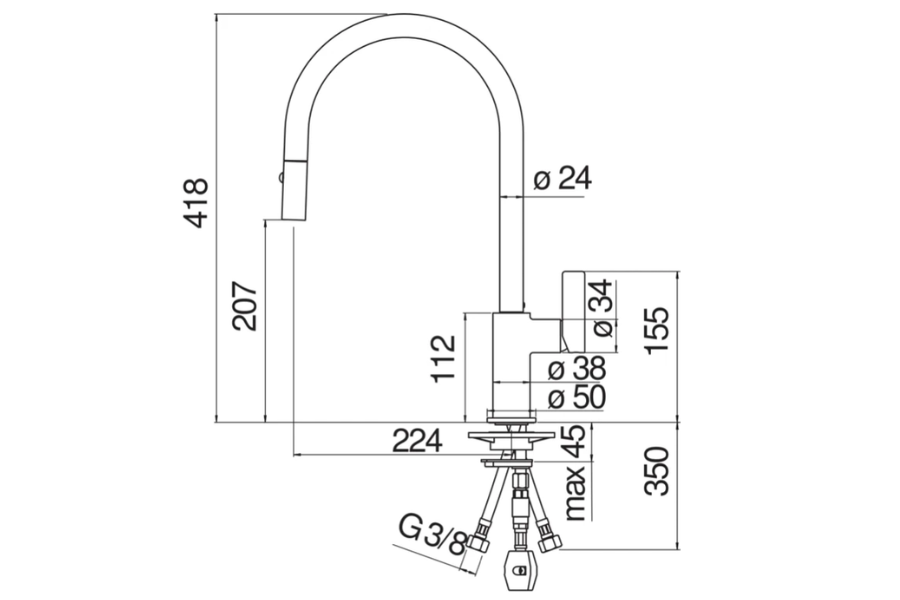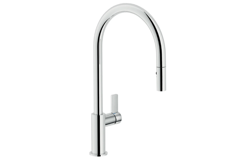 Thiết kế hiện đại, đẹp mắt, hài hòa giữa thân vòi và các bộ phận tạo nên sự thanh thoát. Chiều cao 418mm lý tưởng cho mọi không gian và thao tác bếp.