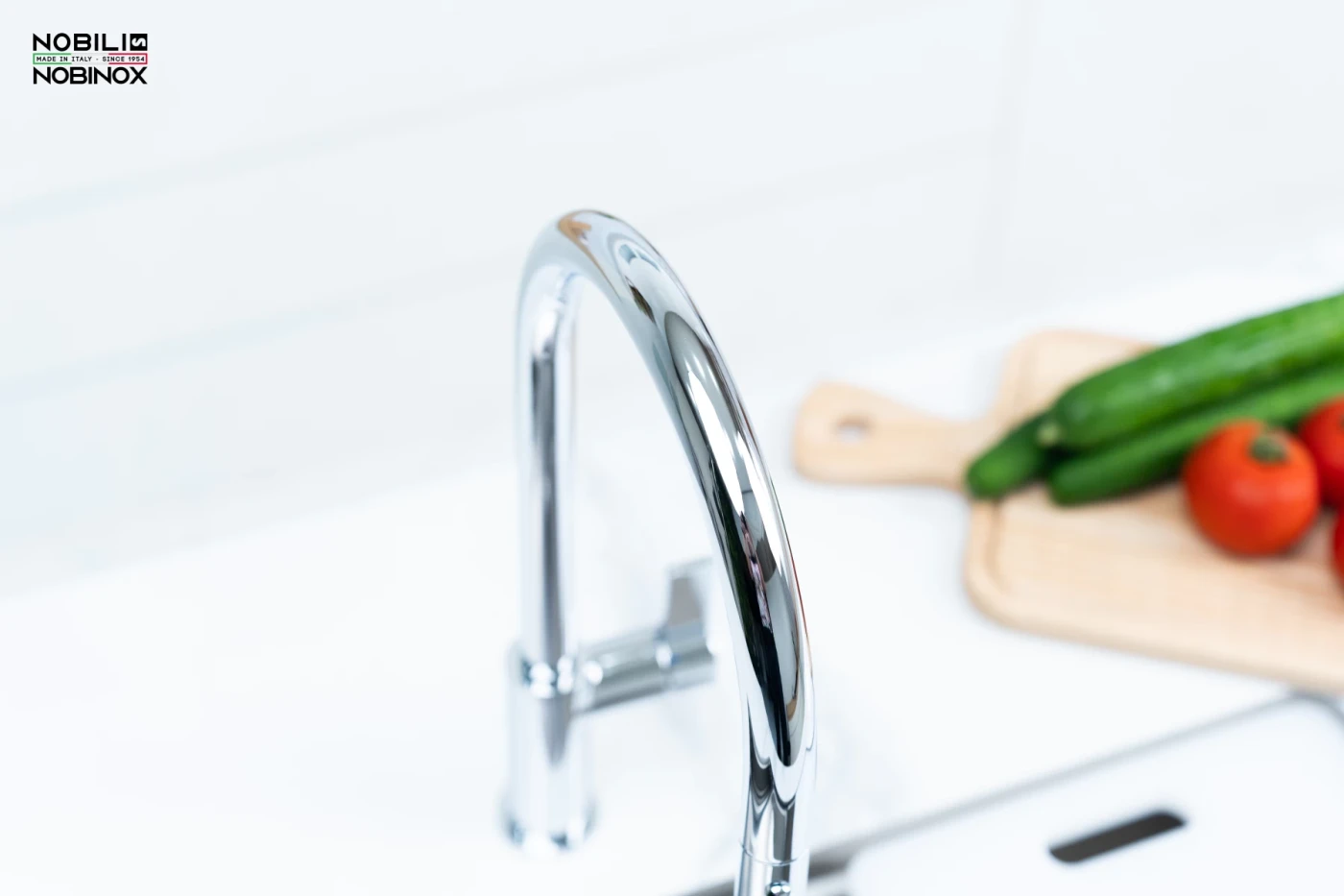 Lớp mạ Chrome hoàn thiện sáng bóng, đảm bảo độ bền cao, chống bám bẩn hiệu quả: Công nghệ mạ Chrome của vòi bếp Nobili không chỉ tạo nên lớp bề mặt sáng bóng sang trọng mà còn đảm bảo độ bền vượt trội theo thời gian. Áp dụng quy trình mạ nhiều lớp đạt chuẩn châu Âu, lớp chrome trên vòi Nobili giúp chống oxy hóa, chống trầy xước và dễ dàng vệ sinh, giữ cho sản phẩm luôn như mới sau thời gian dài sử dụng. Nhờ lớp phủ đồng đều, bám chắc, vòi không bị bong tróc dưới tác động của nước nóng, hóa chất tẩy rửa hay độ ẩm cao – đáp ứng hoàn hảo tiêu chuẩn của một gian bếp hiện đại và tinh tế.