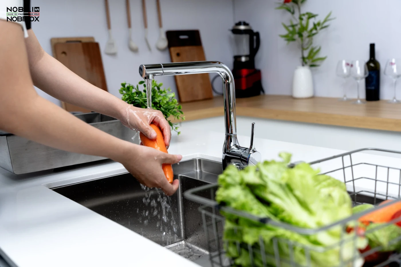 Các dòng vòi rửa bát nóng lạnh Nobili còn được trang bị bộ giới hạn nhiệt tích hợp – một giải pháp an toàn thông minh giúp kiểm soát nhiệt độ nước đầu ra, ngăn ngừa nguy cơ bỏng do nước quá nóng, đặc biệt hữu ích với gia đình có trẻ nhỏ hoặc người lớn tuổi.
