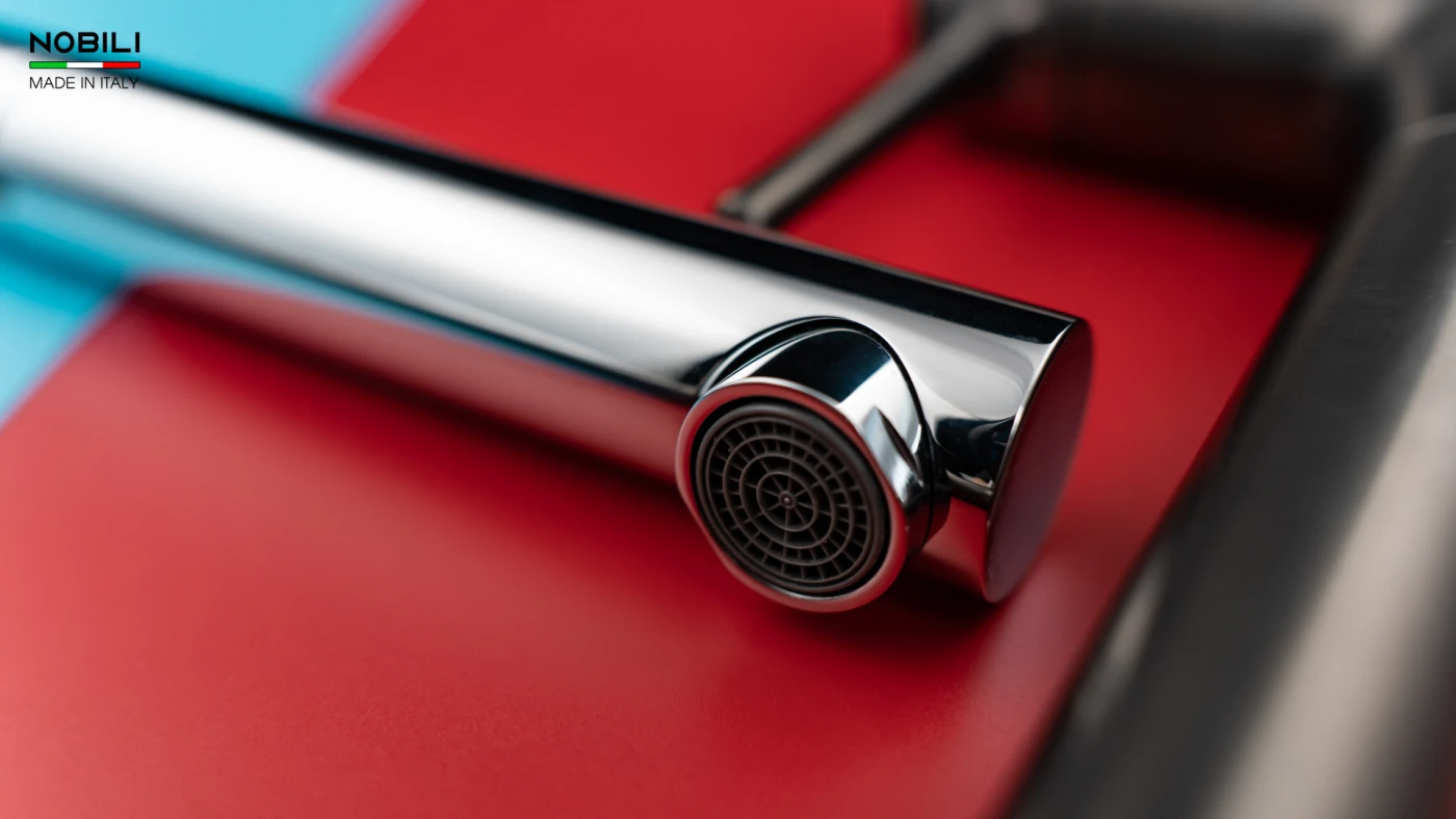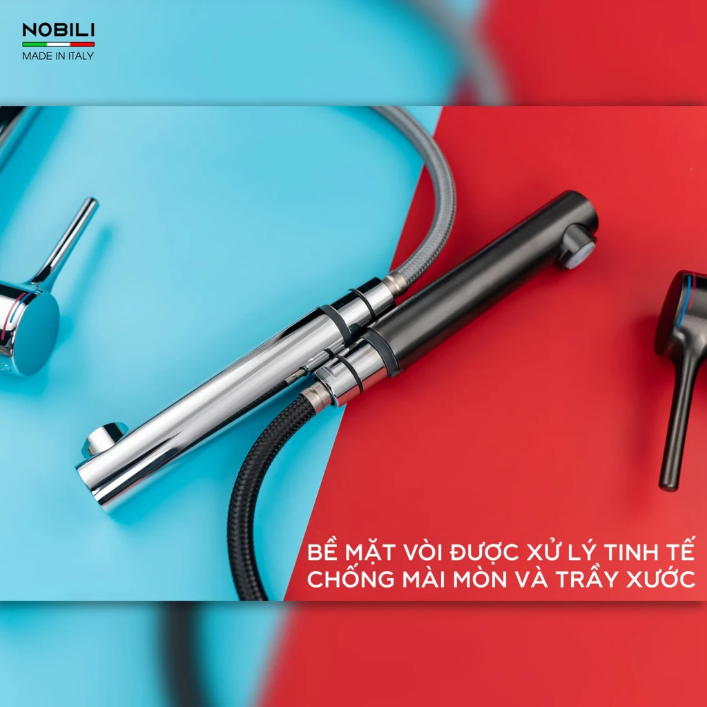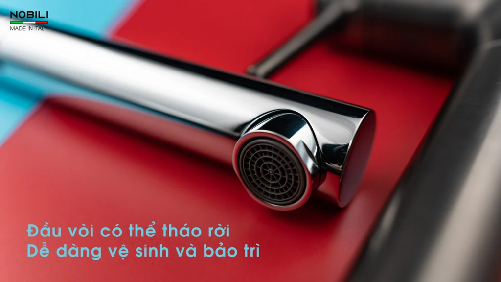 Đầu vòi của vòi rửa bát Nobili được thiết kế thông minh, có thể tháo rời dễ dàng chỉ với thao tác đơn giản. Nhờ đó, người dùng thuận tiện hơn trong việc vệ sinh, loại bỏ cặn bẩn, vôi hóa và bảo trì định kỳ, giúp duy trì áp lực nước ổn định và kéo dài tuổi thọ sản phẩm.