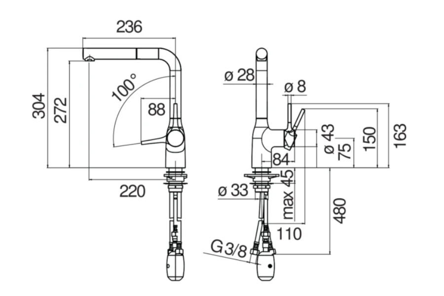 - Tay vòi ngang di chuyển mượt mà, linh hoạt, tối ưu không gian bàn bếp.