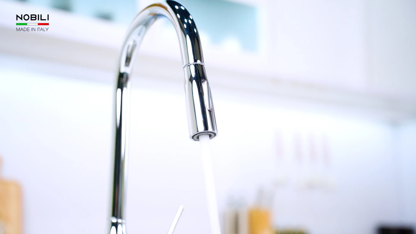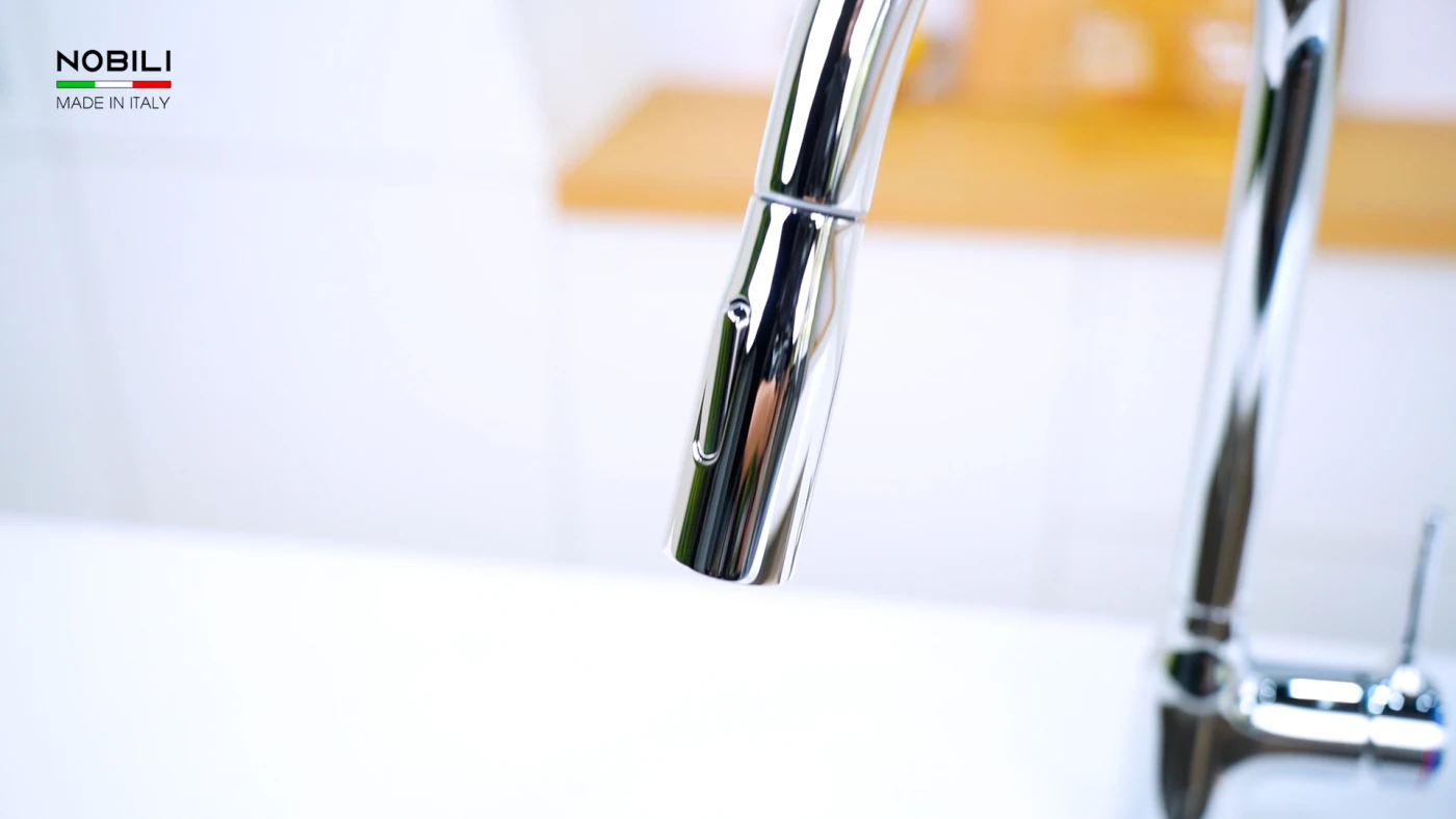 Đầu vòi của vòi rửa bát Nobili được trang bị lưới tạo bọt cao cấp được thiết kế có lớp bề mặt elastomer mềm, giúp dòng nước chảy ra êm dịu, mịn màng và không bắn tung tóe. Nhờ đó, người dùng vừa tiết kiệm nước, vừa có trải nghiệm rửa sạch nhẹ nhàng, thoải mái trong từng thao tác.