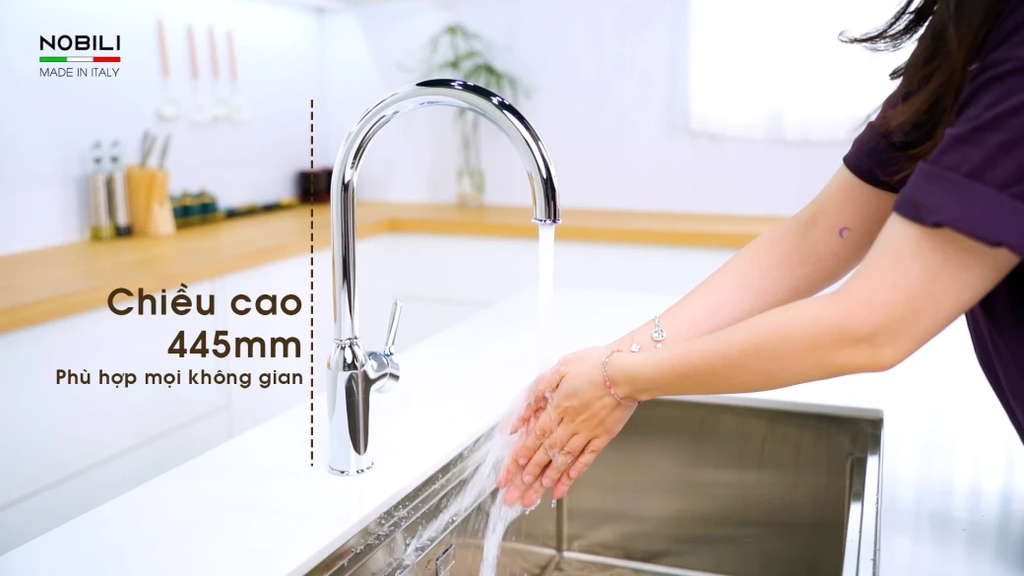 Với chiều cao là 445mm đã qua tính toán chuẩn mực, RING NB132 cho phép bạn thao tác dễ dàng với mọi loại nồi, chảo, khay hay bát đĩa lớn. Bạn sẽ không gặp cảm giác chật chội khi rửa, ngay cả khi đặt vật dụng cồng kềnh trong bồn. Đây là điểm cộng lớn giúp vòi phù hợp với mọi không gian bếp.