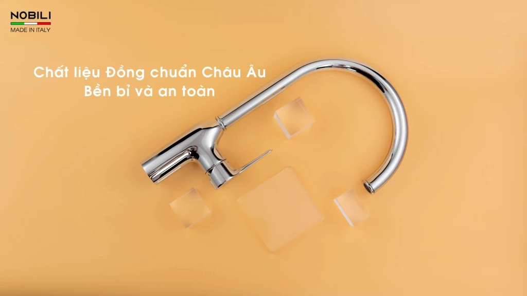 Toàn bộ vòi bếp Nobili đều được chế tạo từ hợp kim đồng cao cấp với hàm lượng đồng tinh khiết lên đến 62%, không chứa chì, đảm bảo độ bền cơ học vượt trội và khả năng chống ăn mòn tối ưu. Đây là chất liệu đạt chuẩn Châu Âu, thường được sử dụng trong các thiết bị dẫn nước cao cấp. Tỷ lệ đồng lý tưởng này giúp vòi bếp Nobili vừa chắc chắn, vừa an toàn cho sức khỏe người dùng do hạn chế tối đa tình trạng giải phóng kim loại nặng trong nước.