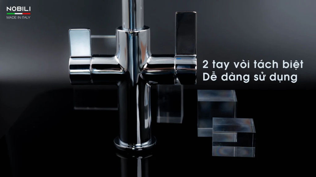 Thiết kế hai tay điều khiển riêng biệt của ROSA NB164 đem lại lợi thế rõ rệt trong sử dụng: một tay quản lý nhiệt độ nước nóng – lạnh, tay kia điều khiển dòng nước tinh khiết.
