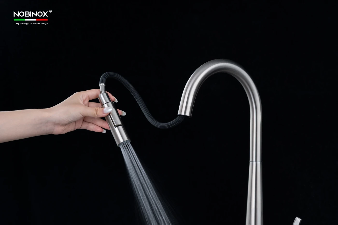 - Vòi bếp dây rút nóng lạnh xoay 360 độ cho phạm vi tiếp cận lớn, linh hoạt sử dụng trong thao tác bếp.